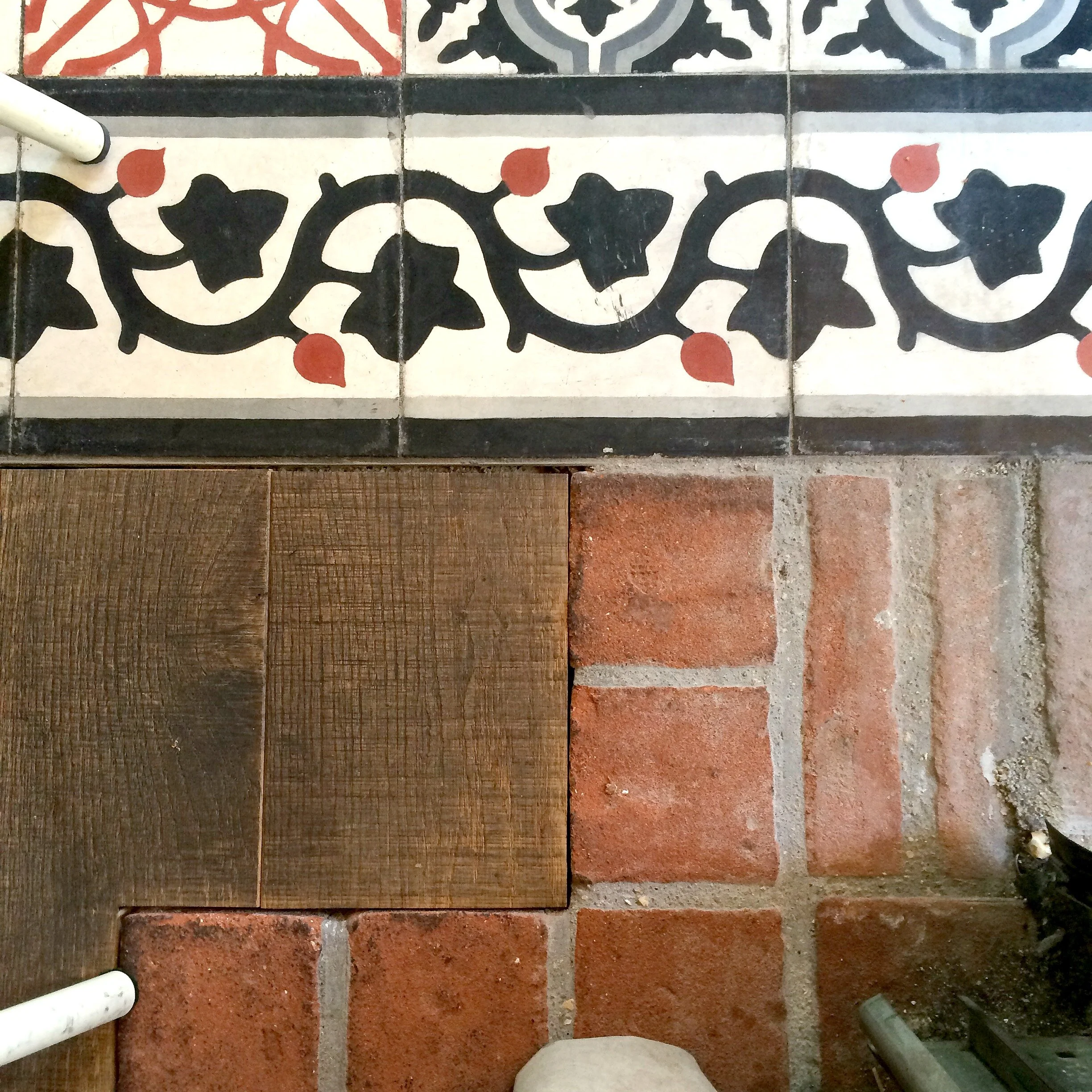 Marvel at this mix on the floor. Brick, wood and tile all patchworked in. GORGEOUS!