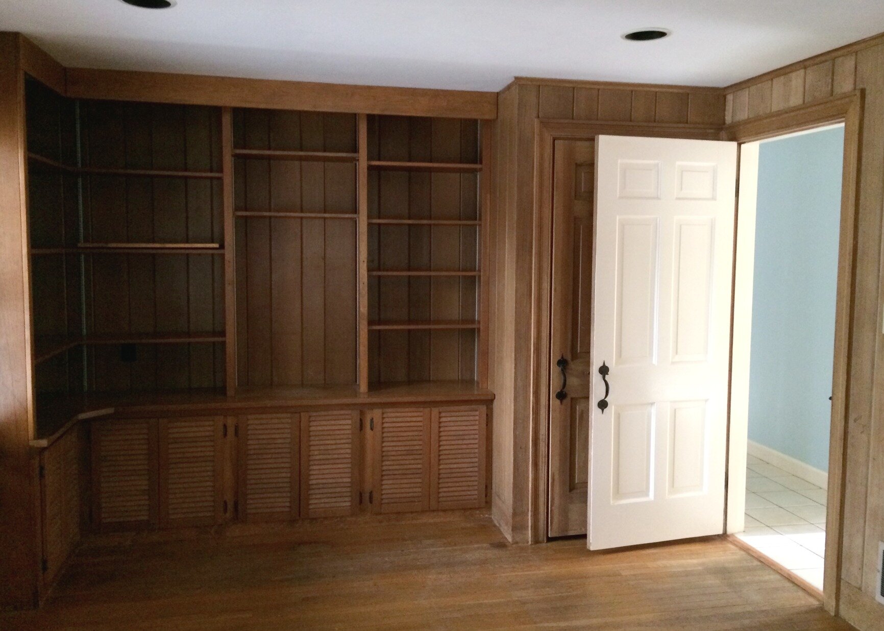 The room is cleared out ... and this wall of shelving came down. We considered tearing out that closet, but ultimately decided to keep it their to house all the cable boxes, routers, printer, etc. It has become our command central!