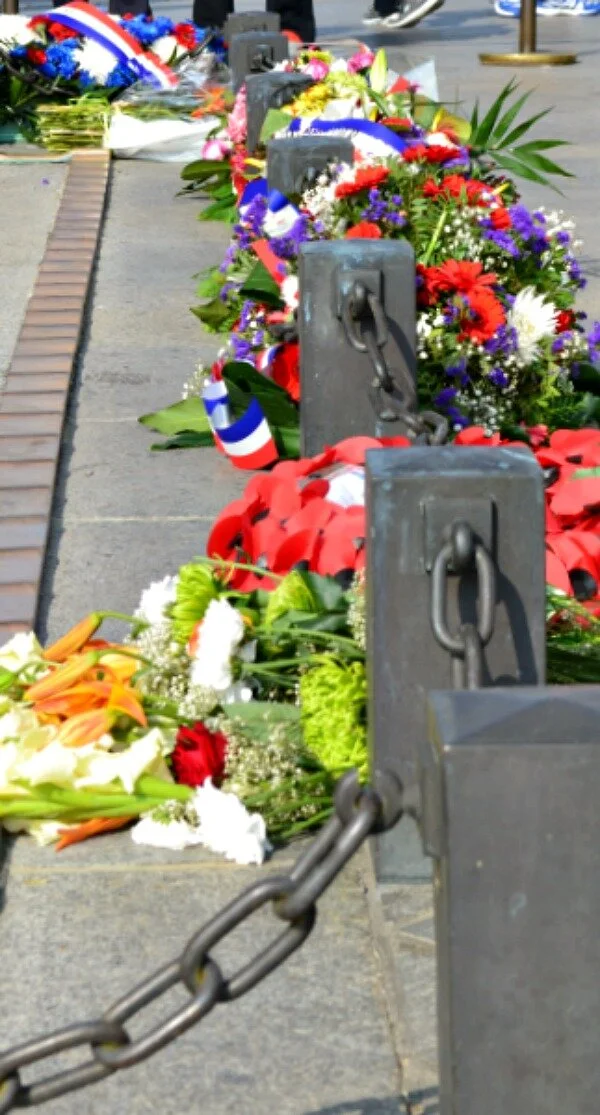 Flowers marking the Tomb of the Unknown Soldier under the Arc.