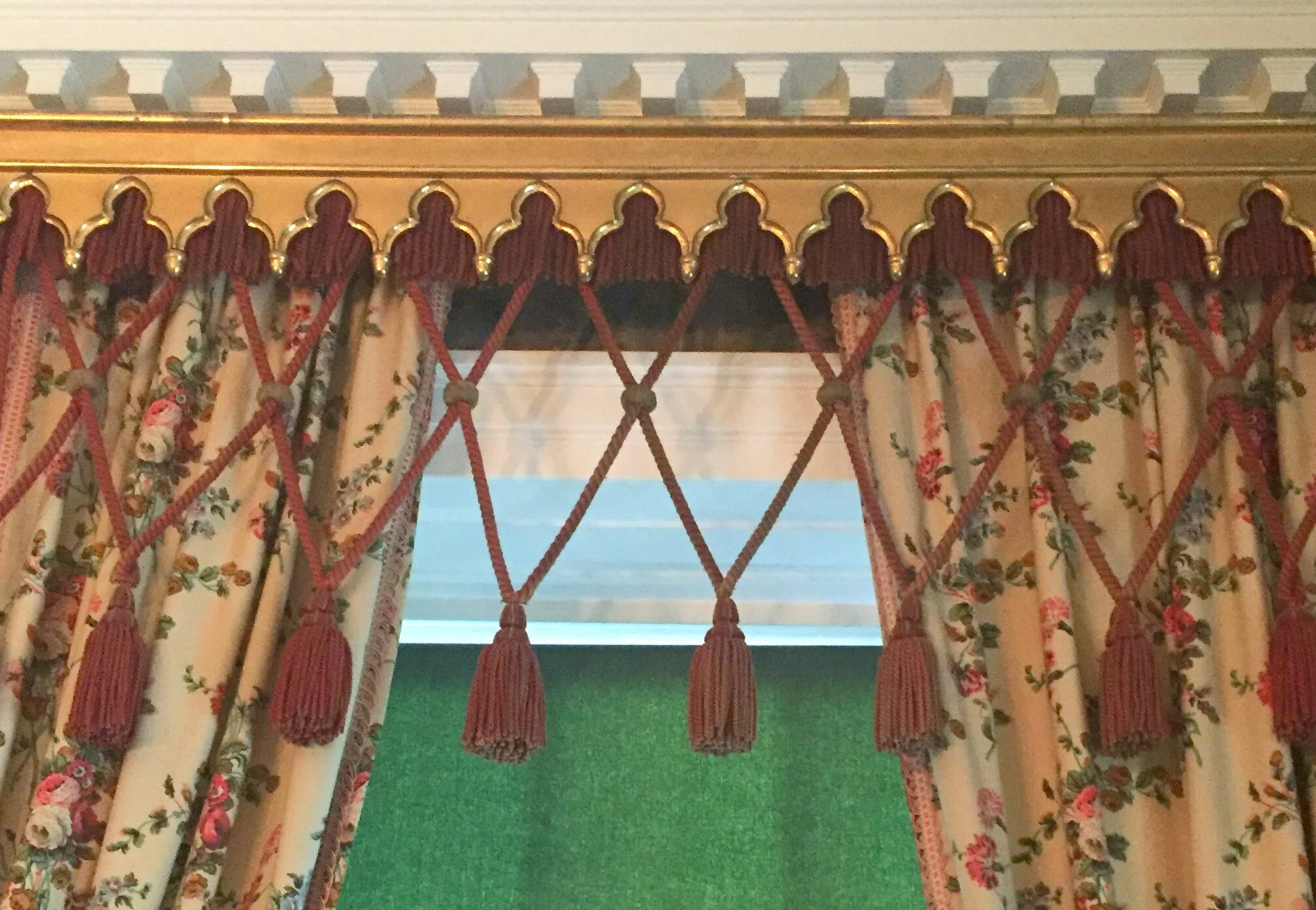 Crown moldings everywhere and in the non-minimalist style ... a little added punch for the cornice. Crown. Metal. Fringe. Tassels. Alrighty then!