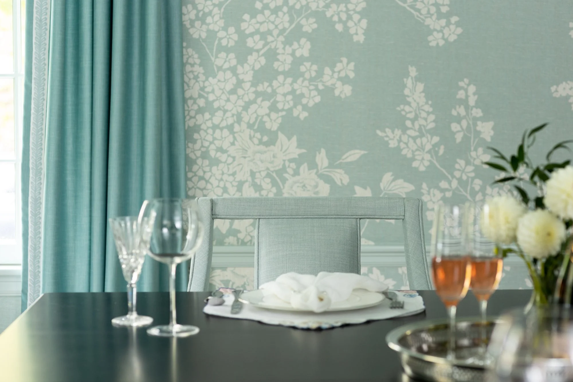 Curtains can also create a sense of calm. The monochromatic design in this room is so soothing, but without the curtains it would fall flat. They add a much needed variation both visually and texturally. You can almost feel the breeze of the outdoors with the way they drape. And imagine the feeling dining here, being wrapped in a pool of blues with a hug from the curtains! Serenity and joy abounds!