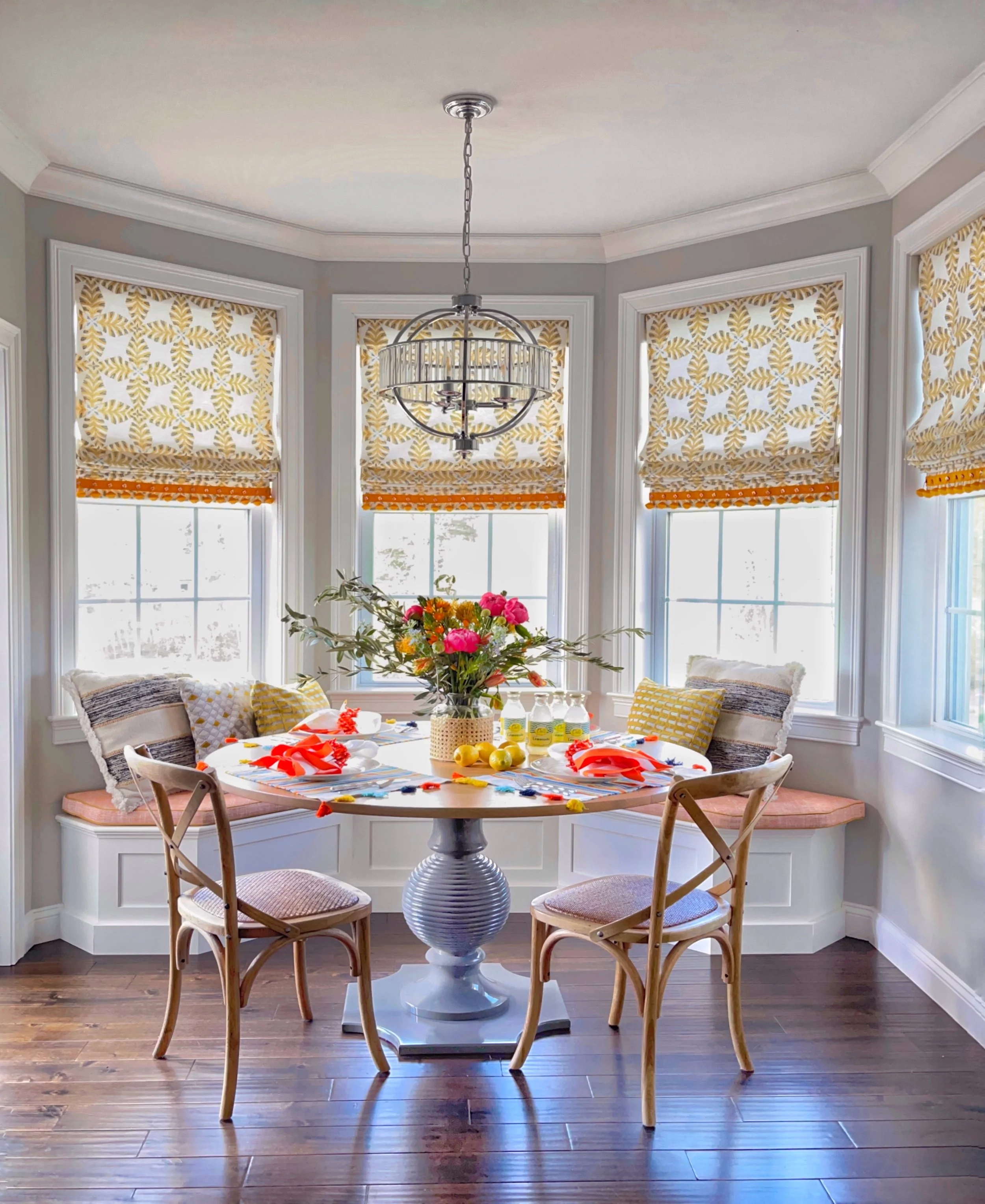 This kitchen nook is filled with custom elements, the gorgeous table, the custom built-in window seat and custom window treatments. Off the rack chairs complete the space! These pieces will last in this busy, well used corner of the house a lot longer than something you may order online.